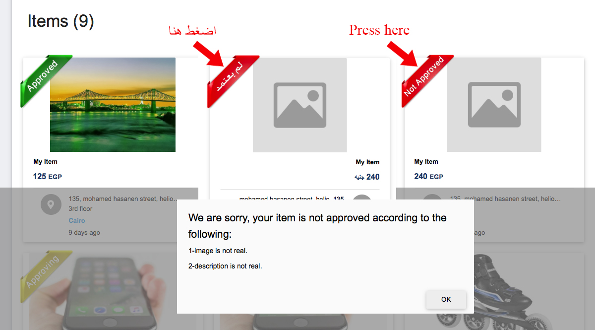 ٤- ستقوم إيبيكيا بمراجعة السلعة الخاص بك والموافقة عليها لتكون مرئية لجميع المستخدمين للشراء أو قد يكون لدينا بعض الملاحظات أو الأسباب لرفض السلعة وسيتم إعلامك عن طريق البريد الالكتروني وعلى صفحة حسابك بشأن ملاحظات الرفض هذه لمتابعتها ، تعديل سلعتك وفقًا لذلك وحفظ التعديل حتى تقوم إيبيكيا بمراجعتها مرة أخرى وتوافق على السلعة إذا كان كل شيء على ما يرام.